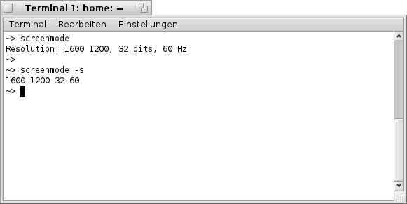 Beim Aufruf von "screenmode" oder "screenmode -s" (gibt eine Kurzform ohne Bezeichnung und Trennzeichen aus) erhält man Informationen zu den momentan eingestellten Werten, wobei die Bedeutung der Werte Folgende ist: