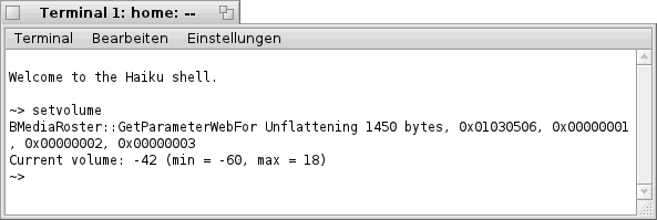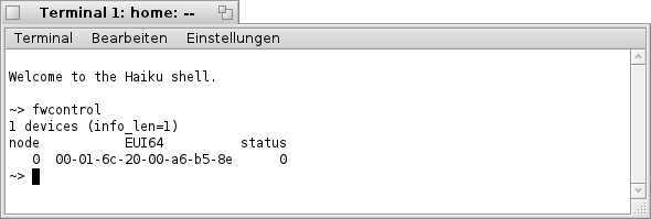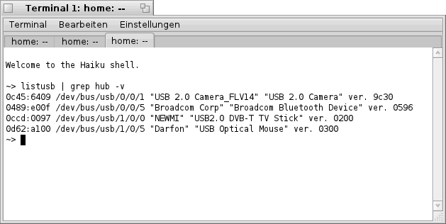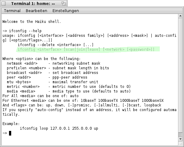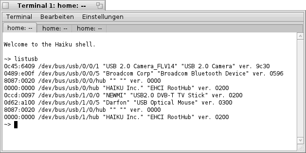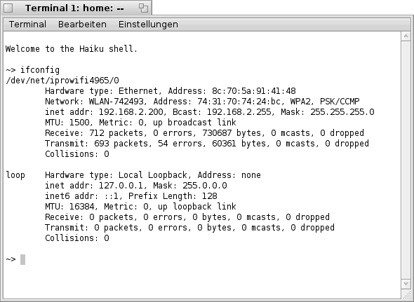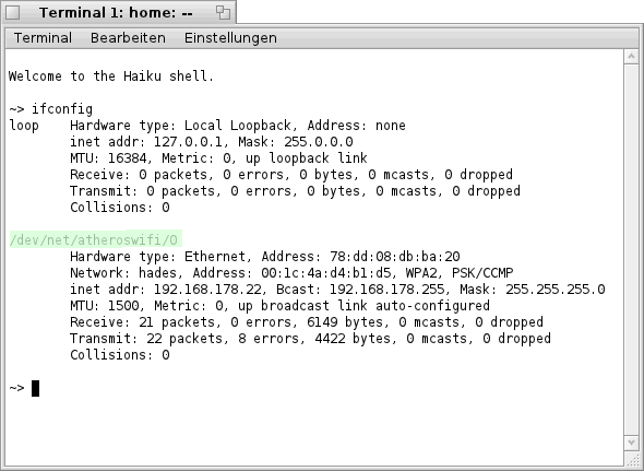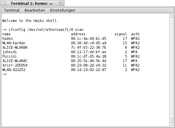im "Terminal" bekommt man die folgende bzw. eine ähnliche Liste zu sehen. Hier sind, wie bereits oben erwähnt, alle Netzwerk- Karten welche Haiku erkannt hat aufgelistet (siehe Bild).
