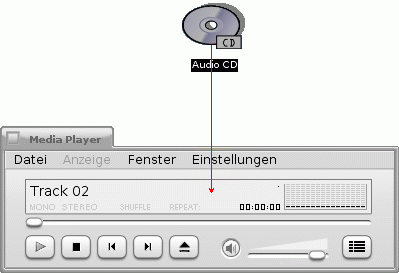 Öffnen Sie den Mediaplayer, welchen Sie im Zetamenü unter Software/Musik finden. Nun klicken Sie das Audio CD Symbol auf dem Desktop an (linke Mousetaste), halten die Mousetaste gedrückt, und schieben das Symbol auf den Mediaplayer (gleiche Vorgehensweise beim CL-Amp).