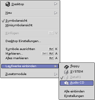 Hierfür legen wir die Audio Cd in das Cd- Laufwerk ein, warten einen Augenblick bis das Laufwerk diese erkannt hat und machen dann einen Rechtsklick auf dem Desktop. Mit dem Rechtsklick öffne wir das Rechtemoustaste- Menü, in welchen wir auf Mounten gehen und dort die Audio Cd auswählen. Unter Zeta R1 heißt diese Option Laufwerke einbinden (siehe Abbildung).