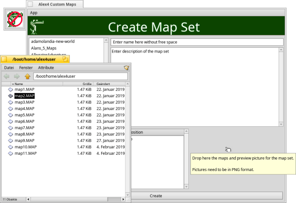 Um eine neue Zusammenstellung von Levels zu erstellen (z.B. die eigenen) gehe im App-Menü auf Create new map set.