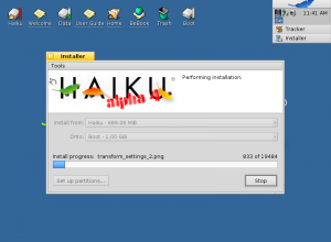 Dafür bietet Haiku das DriveSetup Programm, was sich etwa mit Gparted vergleichen lässt. Als Dateisystem kommt Be FS zum Einsatz, was wieder die Verbindung zu BeOS erahnen lässt. Zwar gibt es als weiteren Dateisystemtyp NT, aber ich würde hierbei vermuten, dass es sich wohl kaum um das NTFS Format von Microsoft handelt. Die eigentliche Installation läuft problemlos ab, die Dateien der Boot Festplatte werden lediglich samt Bootloader auf die Zielplatte kopiert.