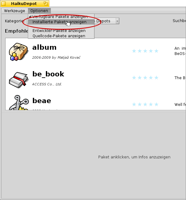 Since Haiku Depot by default only displays the available packages, we need to enable the display of installed packages only. For this purpose we choose in the Options menu Installed Packages.