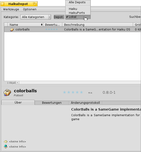 ColorBalls, is at the time of this tutorial, just as Haiku Package (HPKG) to relate. This can be loaded for example from BeSly Software Repository.