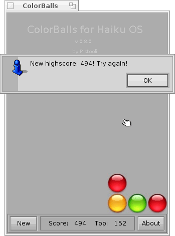 ColorBalls is a replica of the famous SameGame game for Haiku. The goal is to remove so many balls as possible from the playing field. Best is to remove all. You will see this is not so easy. For every removed ball you get points.