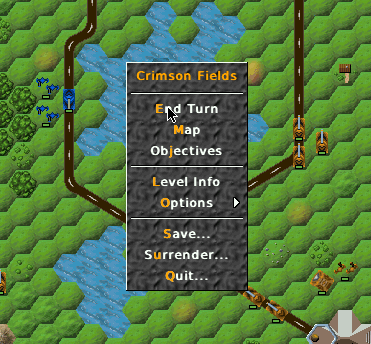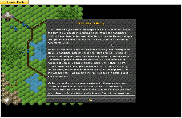 Crimson Fields is a turn-based strategy game. The aim is to take the headquarter of the opposing army or destroy all their units. The player have a variety of unit types, such as Tanks (light, heavy), artillery, infantry and ships available. Initially, all units are equally strong, but this will change during the course of the game. By each hit or win of a battle, the unit get a upgrade ( 1 senior signs, 2 senior signs... up to big star (elite unit)). There are various types of buildings such as Headquarters, depots or factories. In most cases, these must however first be conquered. This is possible only by infantry units. If you have this building occupied, you can find there more troops, or has the possibility of more units to produce in the factorys. In all buildings, it is possible to repair damaged units. But it is not possible to repair or produce unlimited units, because each building has a limited amount of raw materials (crystals).