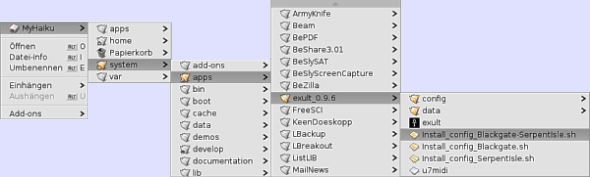 Have you installed Exult over our HPKG file, you can install the configuration file comfortable using a respective script. You can found the scripts at /boot/system/apps/exult_0.9.6. Choose here the appropriate script: Black Gate, Serpent Isle, or Black Gate und Serpent Isle. |