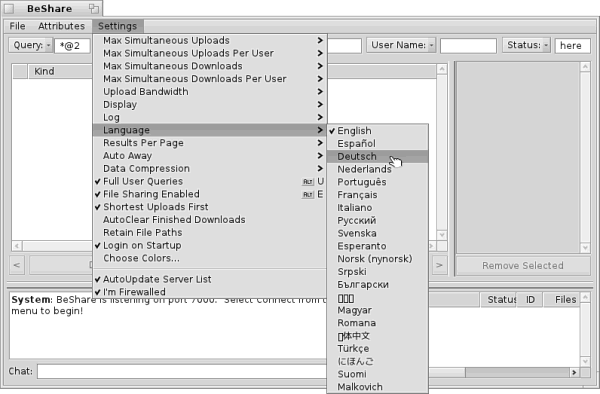 If you want to use the program in an other language, open the Settings menu and select at Language a language of your choice. You need to restart BeShare.