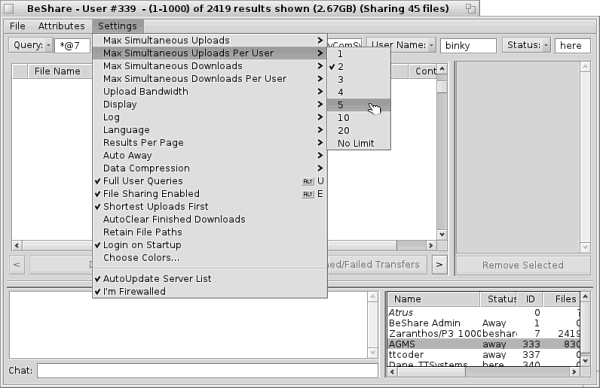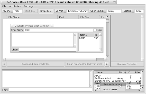 BeShare is a file sharing program based on MUSCLE for Haiku, BeOS and Zeta. In contrast to other file sharing programs, your nickname are visible for every othere people using BeShare. By selecting your nickname in the user field, other can see your shared files. Included in BeShare is a chat function, so you can talk to the other people.