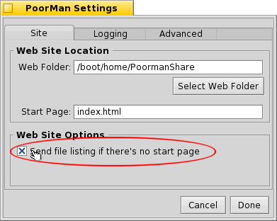 Attention If you don't want to share your files every time you start up poorman, deselect the option "Send file listing if there's no start page" then you end the process of sharing |