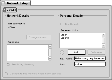 If you wish that Vision connect to the server at startup automaticly switch the checkbox at Connect to this network when Vision starts up to ON.