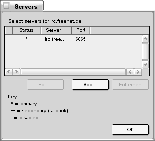 We select Change servers... in order to setup a IRC connection. You get a new window with the name Servers.