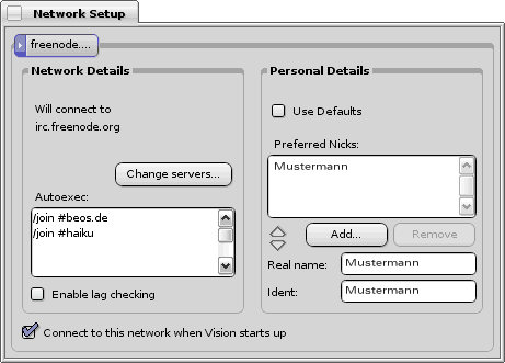 Enter at "Autoexec>" the channels you want to join automatically then vision starts. It is the same command you use to join a channel in the vision chat screen. Enter "/join #beos.de in order to connect to the #beos.de channel. If you want to join more then one channel at the same time enter the other in the next lines.