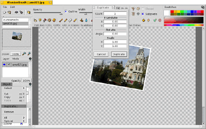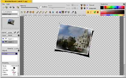 Wonderbrush crea un primo layer che contiene l'immagine da ridimensionare a piacere. Nel riquadro Object , che mostra tutti gli oggetti presenti sul layer attivo, avremo una voce Bitmap ( l'immagine appena aperta) che selezioniamo per poi inserire come valore in Rotate, Angle 10.