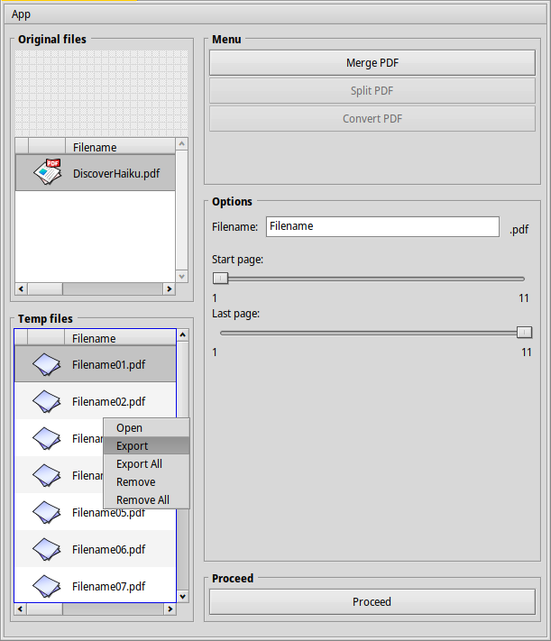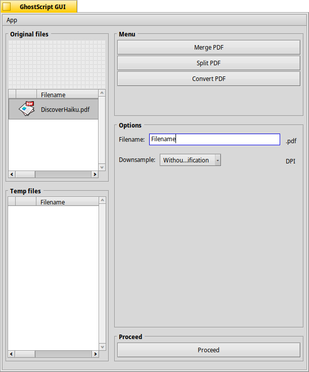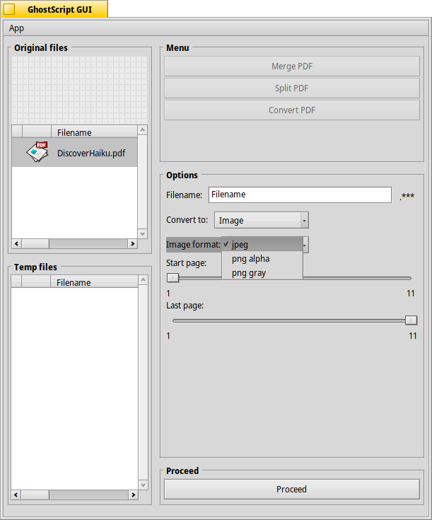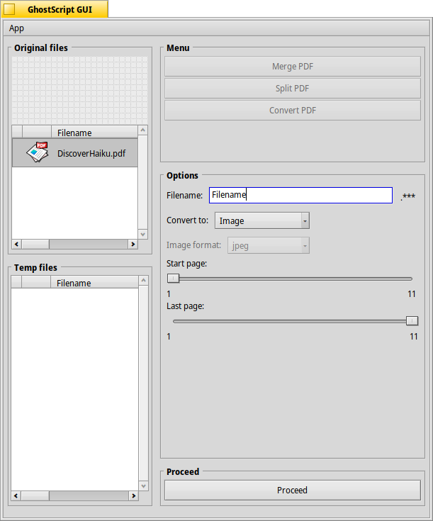 At the moment the program can only split or merge PDF files. Other functions, such as converting to postscript files, are to follow.