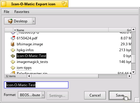 ...search the system for the desired file and select it. Select the format BEOS:Icon Attribute and press Save.