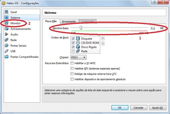 Etapa 02: Na opção "Sistema", foi escolhido a quantidade de 512MB de memória RAM. Note que é necessário possuir na máquina real (HOST) uma quantia superior à quantia escolhida, uma dica é nunca ultrapassar a linha verde (1). Depois clique em Monitor (2).