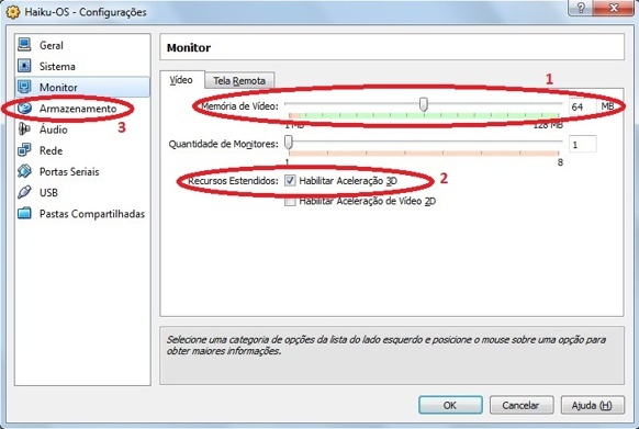 Etapa 03: Na opção "Monitor", a Memória de Vídeo (1) escolhida foi de 64MB (Essa quantia mais a quantia da etapa anterior não deve ultrapassar a metade da memória física total da máquina HOST). Caso sua máquina possua suporte 3D, pode-se marcar a opção "Habilitar Aceleração 3D" (2). Vá agora para a opção "Armazenamento" (3) que é a última opção que precisaremos configurar.