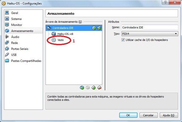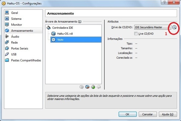Etapa 05: Após efetuar a etapa anterior, se abrirá uma coluna lateral direita e escolha em "Drive de CD/DVD" (1) a mídia de instalação do sistema operacional.
