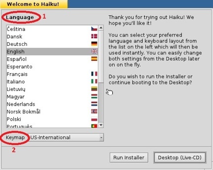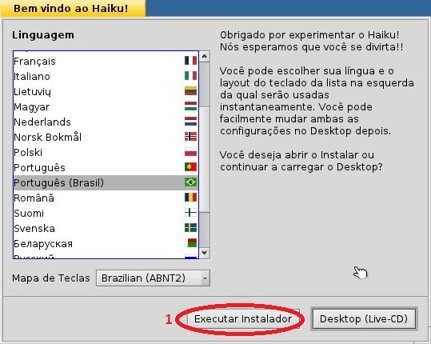 Etapa 09: Escolha o idioma em "Language" (1) desejado que deverá ser usado no Haiku-OS, nesse tutorial foi usado o "Português (Brasil)" e o seu tipo de teclado (ou similar) em "Keymap" (2) que nesse tutorial foi escolhido "Brazilian (ABNT2)".