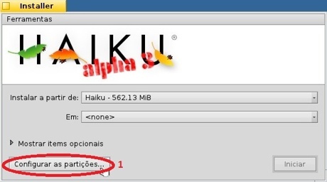 Etapa 13: Agora será preciso criar uma partição para poder instalar o sistema operacional Haiku-OS, para isso clique em "Configurar as partições..." (1).