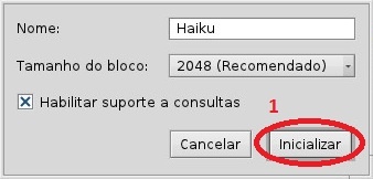 Etapa 17: Aqui pode ser escolhido o nome em "Name" da partição e o tamanho do bloco usado pela partição (não é recomendado alterar o campo "Tamanho do bloco"). Clique em "Inicializar" (1).