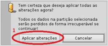 Etapa 18: Como estamos lidando com uma partição em um disco virtual que por sua vez está dentro da máquina virtual, podemos escolher escrever mudanças bastando clicar no botão "Aplicar alterações" (1).
