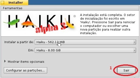 Etapa 23: Agora foi instalado com sucesso o Haiku-OS, basta clicar em "Sair" (1), antes da máquina virtual reiniciar clique na máquina virtual no menu "Dispositivos" vá até a opção "Dispositivos de CD/DVD" e clique em "Desmontar dispositivo de CD/DVD" no submenu que aparecer.