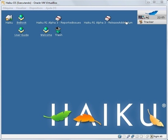 Etapa 25: Quando aparecer a tela abaixo, isso significará que a instalação realizada com sucesso e o sistema operacional Haiku-OS está pronto para ser usado. Para usar as aplicações disponíveis clique sobre o menu (logotipo no lado superior direito) do sistema operacional.