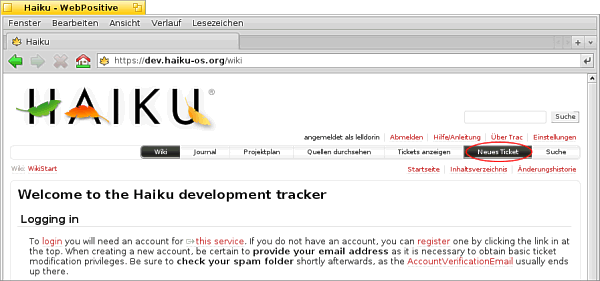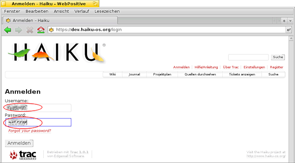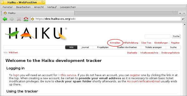 Мы перешли на dev.haiku-os.org и вошли, нажав «Войти» (Log in).