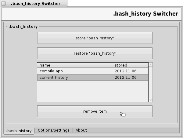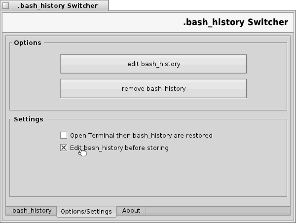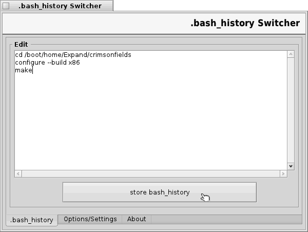 If this options "editing bash_history before storing" is enabled the program opens the current bash_history into an internal text editor before storing. Modify now the bash_history entries to your own desires and press on "store bash_histrory" to archive it.